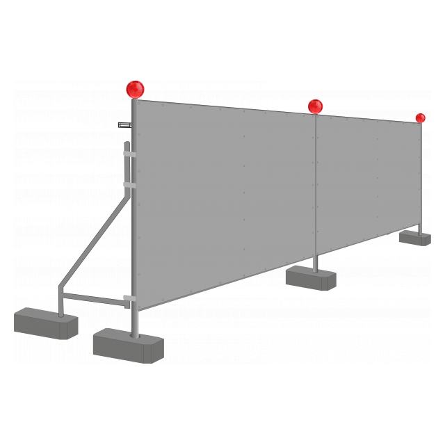 Характеристики ~Габариты секции ~2000 × 2500 мм ~Опорный блок ~бетонный, габариты: 600 × 150 × 250 мм ~Секция ограждения ~рамная ~Рама ~труба Э/С Ø 51 мм, Э/С Ø 25 мм ~Заполнение проемов ~перфорированный или профилированный окрашенный металлический лист