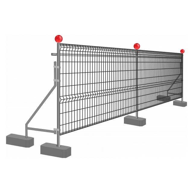Характеристики ~Габариты секции ~2000 × 2500 мм ~Опорный блок ~бетонный, габариты: 600 × 150 × 250 мм ~Секция ограждения ~рамная ~Рама ~труба Э/С Ø 51 мм, Э/С Ø 25 мм ~Заполнение проемов ~3D-сетка. Ячейка 200 × 60 мм. Прут Ø 3мм ~Доп. комплектация ~комплект сигнального освещения, стабилизационная подпорка