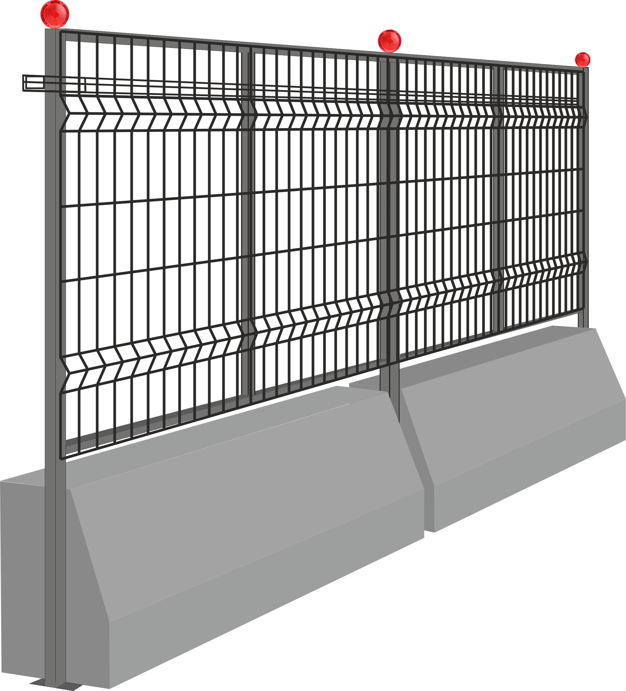 Характеристики ~Габариты секции ~2000×2540 мм ~Опорный блок ~бетонный, сечения 24-4-6У (2400×400×600 мм) ~Секция ограждения ~рамная ~Рама ~трубы из профиля 60×40 мм, 40×20 мм ~Заполнение проемов ~3D-панель из металлических прутьев. ~Ячейка 60×200 мм, прут ⌀3 мм. RAL 6005 ~Доп. комплектация ~комплект сигнального освещения