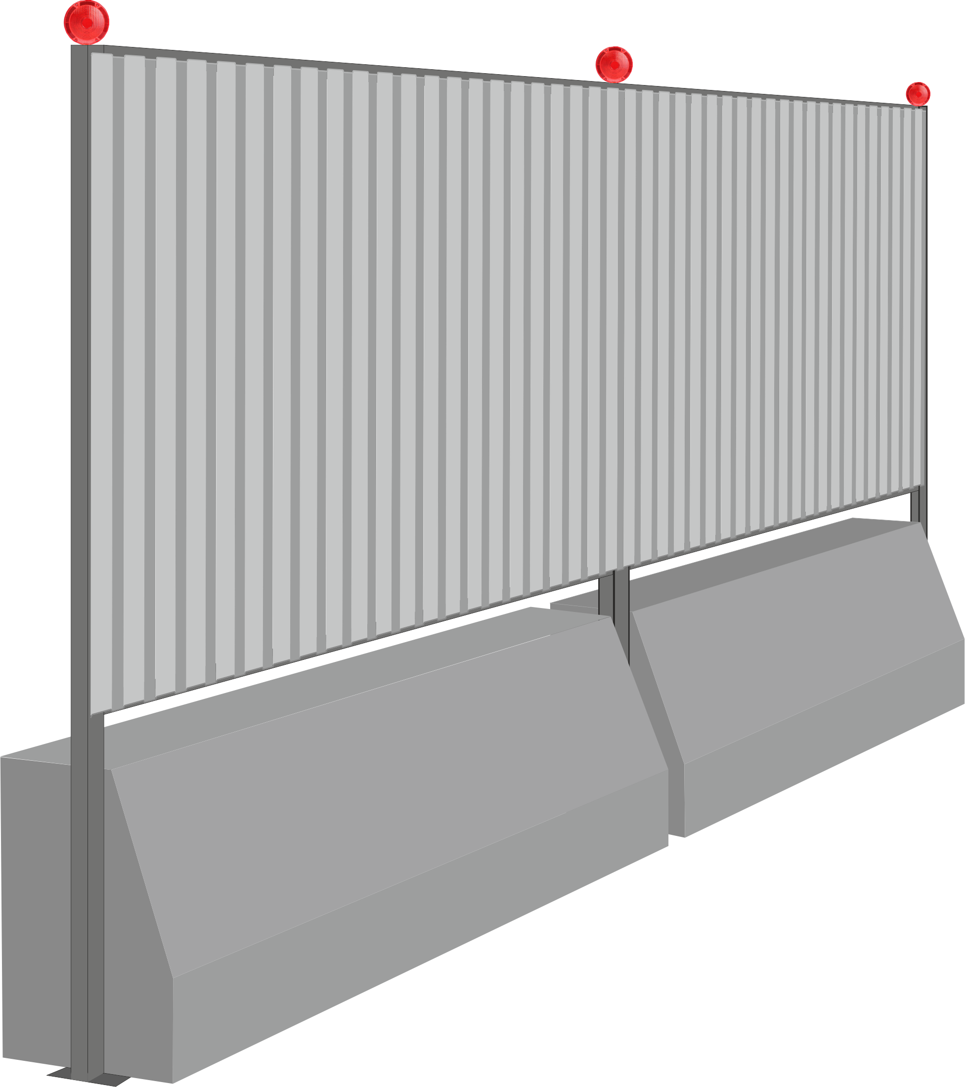Характеристики ~Габариты секции ~2000 × 2540 мм ~Опорный блок ~бетонный, сечения: 24-4-6У, габариты: 2400 × 400 × 600 мм ~Секция ограждения ~рамная ~Рама ~трубы из профиля 60 × 40 мм, 40 × 20 мм ~Заполнение проемов ~перфолист или профлист ~Доп. комплектация ~комплект сигнального освещения. Виды баннерной сетки по требованию заказчика